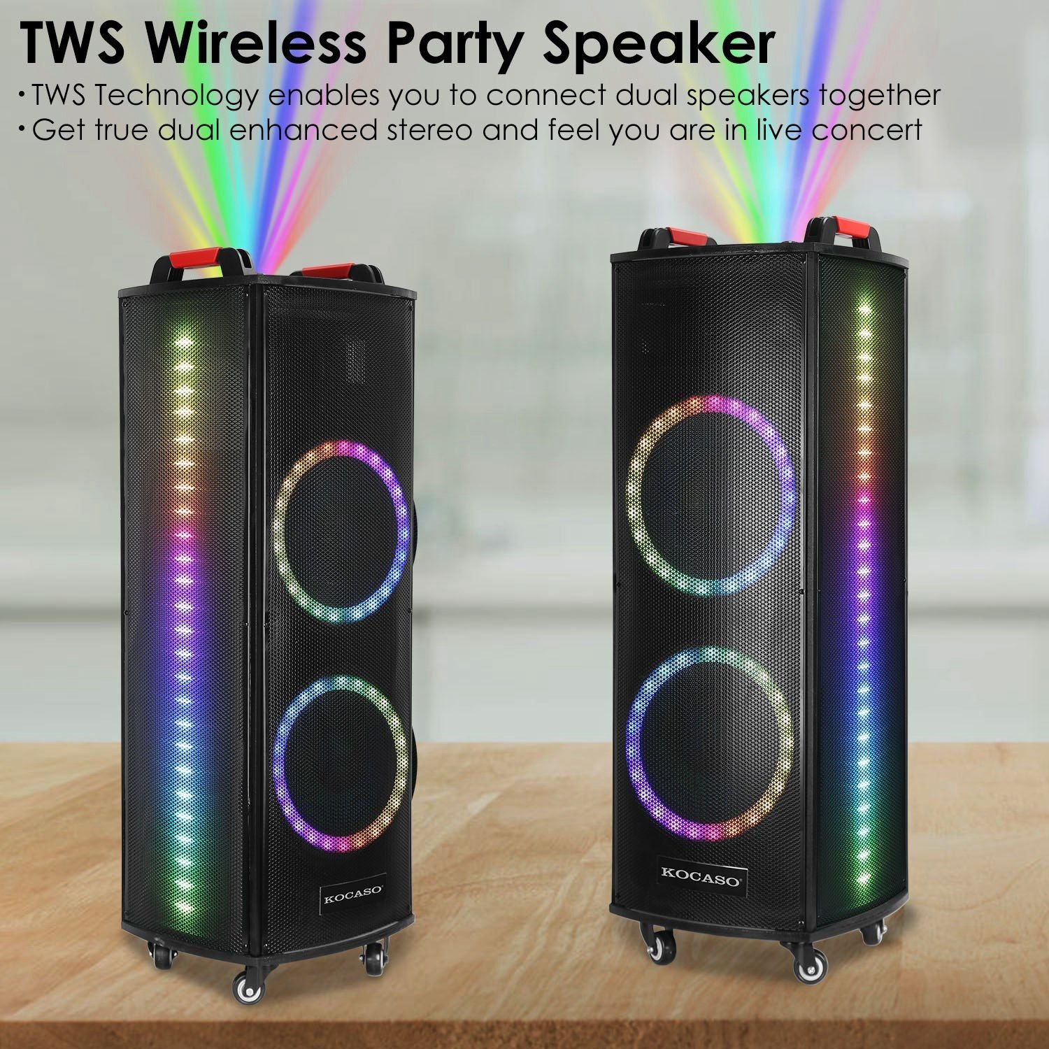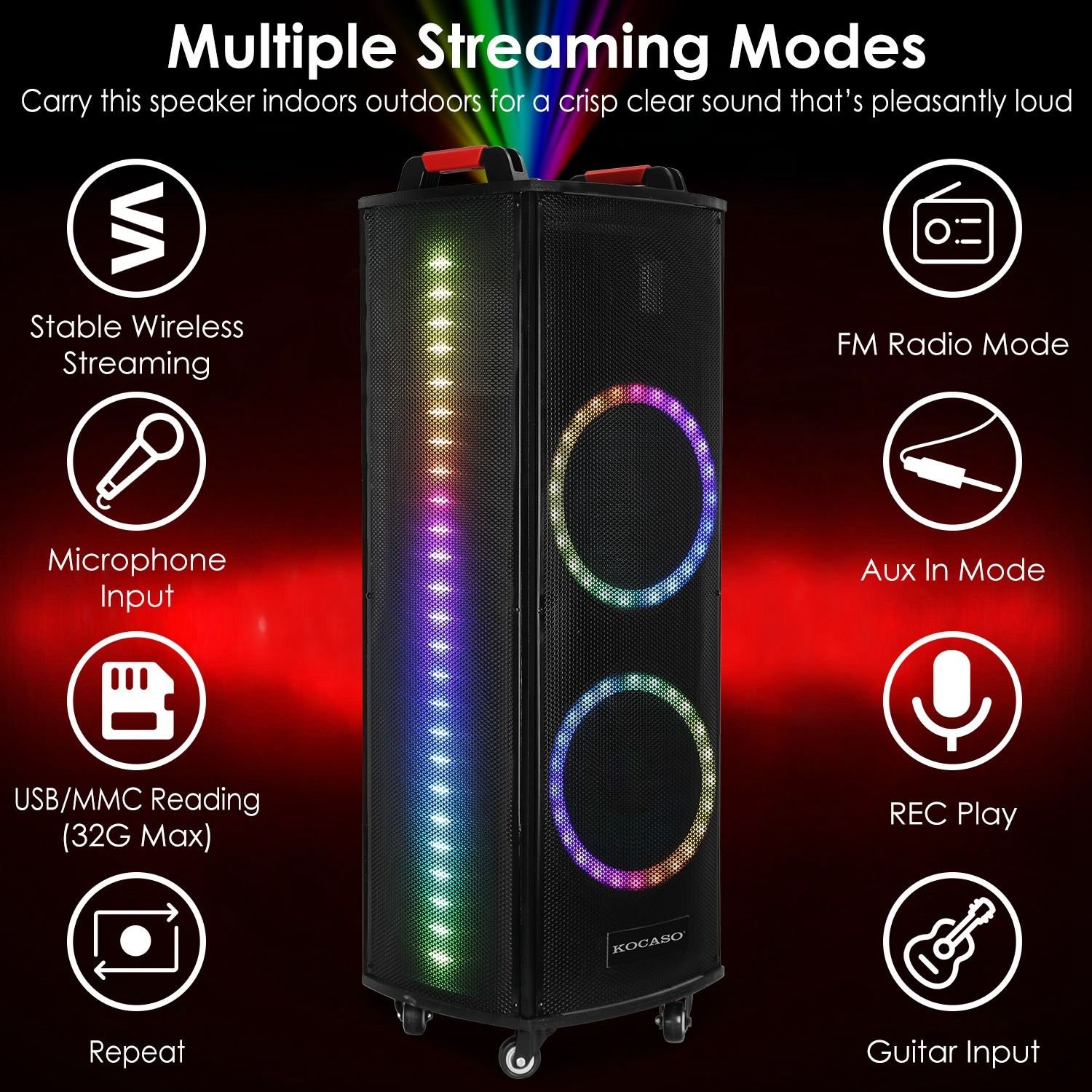 **Multiple Functions*:Featured with true wireless stereo function that connects 2 units together to play music at the same time. Portable party speaker supports guitar instrument input,FM radio,MMC card,AUX input,6MM microphone jack(microphone not included),U disk music playback,smart remote control and digital display.