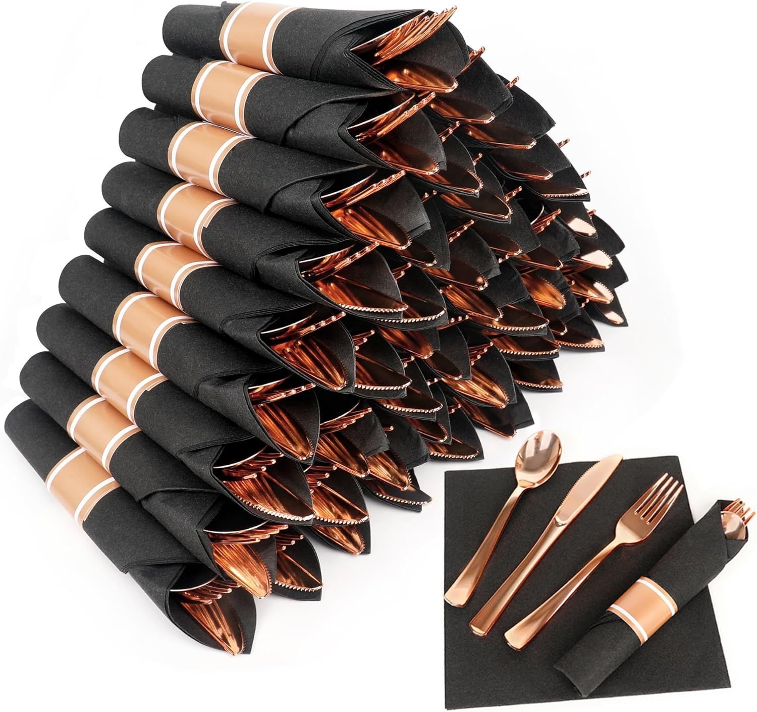 [ PRE-ROLLED CONVENIENCE]As the perfect plastic utensils set, you don't even have to worry about buying party napkins. Our disposable silverware,paired with these pre-rolled napkins, makes your events easier.Prepare breakfast, lunch, dinner or a buffet meal service for 50 honored guests with pre rolled napkins with plastic cutlery set(rose gold plastic forks,plastic spoons,plastic knives). Great value when you are in need of a napkin set with a fork, knife, and a spoon for all kinds of events[SAFE &HEAVY DUTY PLASTIC SILVERWARE SET] Our prewrapped plastic forks and spoons, knives set are made of 100% food grade and BPA-free plastic.The plastic silverware heavy duty won't scratch the skin or break easily so that ensures a safe and happy eating experience for you and your guests!These rose gold plastic spoons and forks plus plastic knife are expertly crafted with sturdy construction,so they are fairly durable and ensuring minimal cracks and breakage during transportation and use[ DISPOSABLE & EASY TO CLEAN] Disposable and reusable, free yourself and your family!Toss these rose gold disposable forks,disposable spoons and disposable knives after party for maximum convenience, or wash by hand for the next time usage.This rose gold silverware disposable can be easily disposed of or recycled for quick party clean-up.Warm Tip:rose gold disposable utensils,disposable cutlery,plastic forks spoons and knives set are not recommended for microwave, oven or dishwasher[ ELEGANT DESIGN&ERGONOMIC ] With decent appearance, you can use the prewrapped |disposable utensils|rose gold plastic cutlery to decorate the dinner table and prepare the feast !This utensils plastic disposable with shiny gold color and highly reflective finish looks like real metal cutlery and perfect for the table arrangement add an elegant atmosphere to the party.This disposable flatware set is designed with an ergonomic handle that can provide a better grip for you while eating or cutting[GREAT FOR ANY OCCASIONS]Luxurious cutlery set disposable is the perfect dinnerware solution for a birthday, party, banquet, reunion, wedding, Christmas, Valentine's Day, Saint Patrick's Day, Easter, graduation, Mother's Day, Father's Day, Halloween, Thanksgiving Day.Our wedding silverware disposable,plastic utensils heavy duty,disposable forks and spoons,knives are also perfect for formal dinners, banquets and dinner parties as well as everyday mealtime, picnics, and informal events and so on[ PERFECT CUSTOMER SERVICE] We not only provide plastic forks heavy duty, spoons plastic disposable and plastic knife heavy duty but also provide good after-sales service. If you have any question, please contact us through amazon at any time. We will reply to you within 24 hours and solve your problems perfectly. What are you waiting for? Click "Buy Now" to own disposable cutlery,forks disposable,rose gold plastic forks,plastic spoons heavy duty,plasticware forks, spoons, knives party supplies