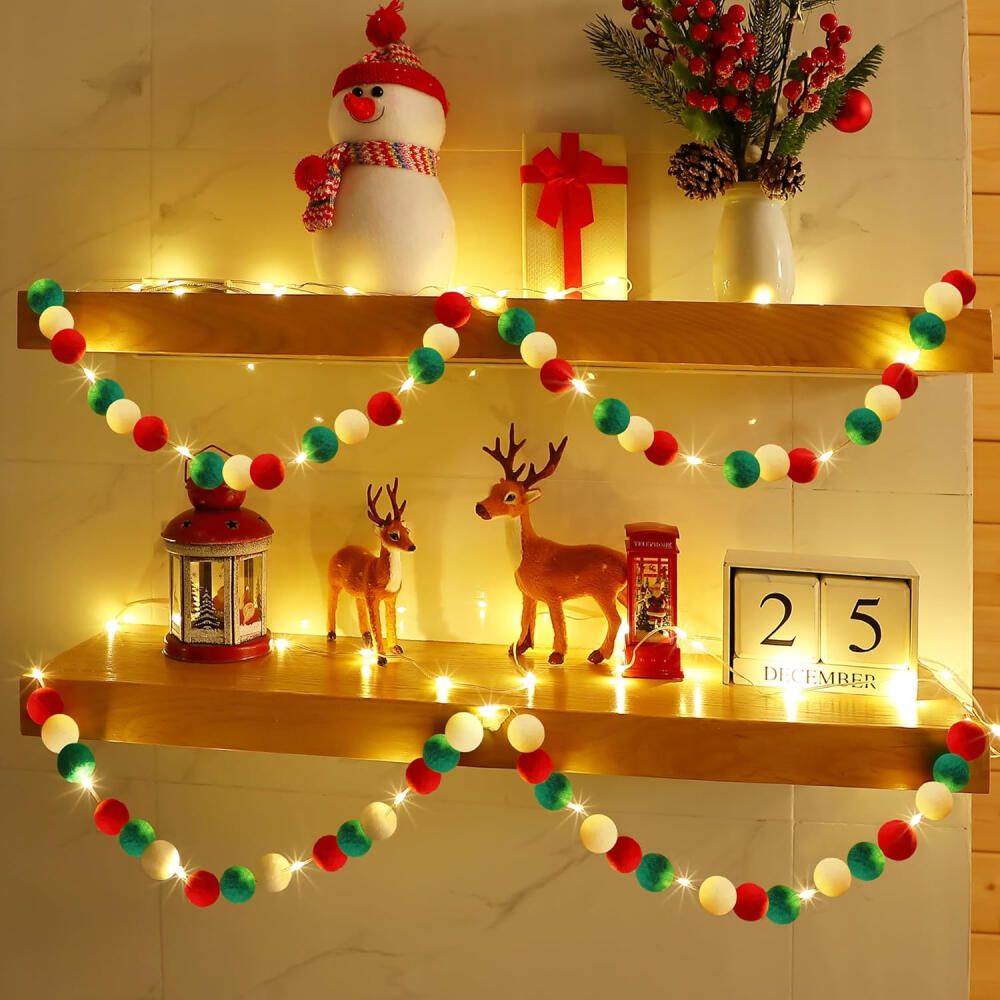 XMAS Garland with Warm Light String Christmas Pom Garland