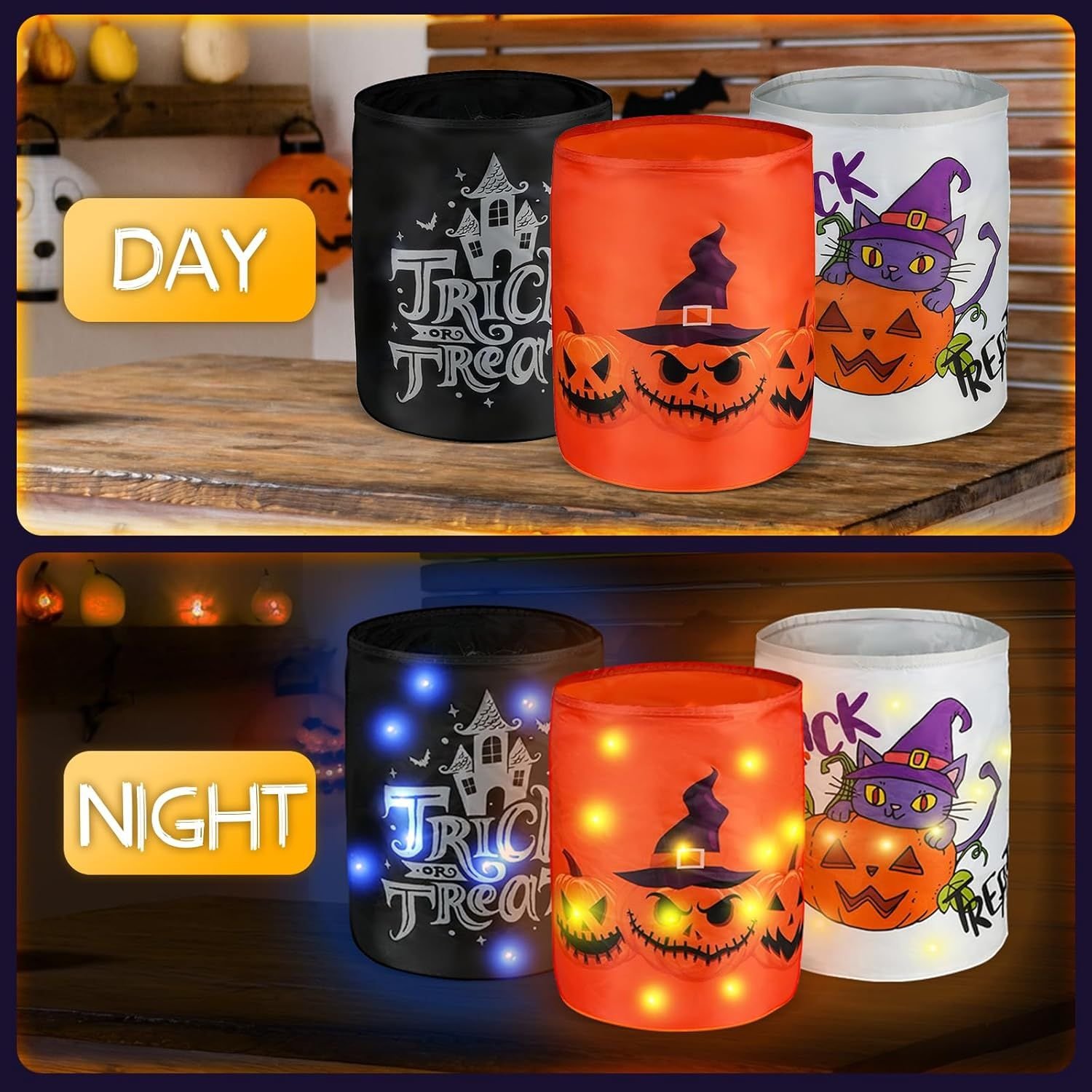 The ATFUNSHOP Halloween Trick or Treat Bags feature built-in LED lights that create a glowing pumpkin design, perfect for nighttime trick-or-treating and parties. Each reusable candy bag is made of high-quality fabric, designed to hold plenty of sweets, toys, and goodies. With a sturdy handle and fun glow-in-the-dark illumination, these bags offer both style and safety for kids during Halloween festivities. Ideal for party favors, classroom gifts, or birthday celebrations.