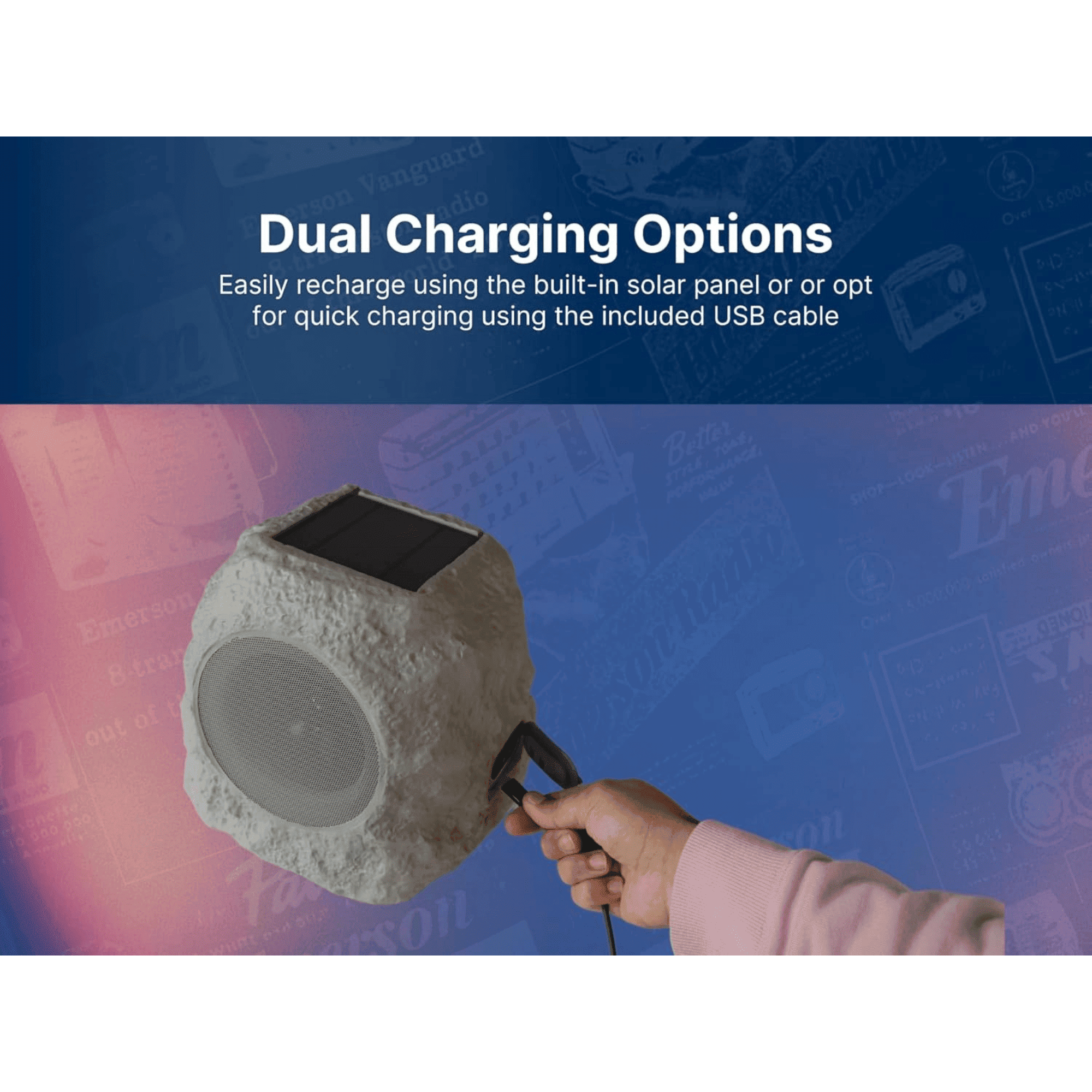 - Dual Charging -- recharge the speaker with a built-in solar panel or connect it to a USB charge cable and compatible adapter