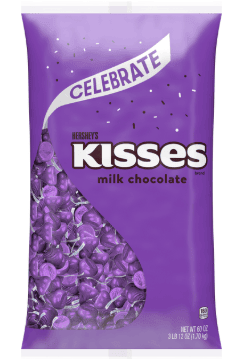 Add a pop of color and sweetness to any occasion with HERSHEY'S KISSES Milk Chocolate Candy in Purple Foils. This 60 oz bulk bag is packed with smooth, creamy milk chocolate wrapped in elegant purple foil, making it perfect for weddings, baby showers, birthday parties, candy buffets, or everyday snacking. Each piece is individually wrapped for freshness and easy sharing, making them ideal for filling candy dishes, gift bags, or event favors.