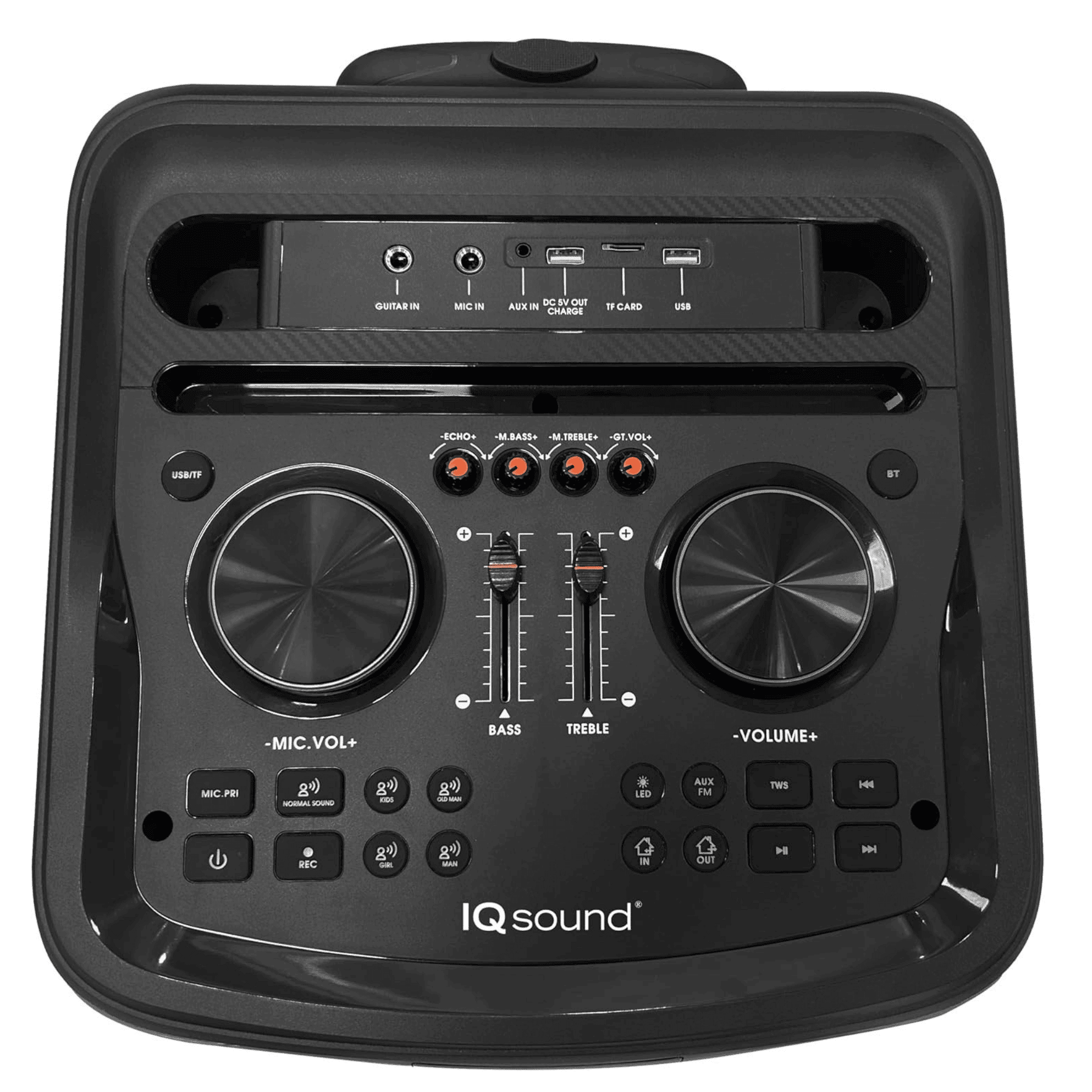 Take your music anywhere with this powerful 12" Portable Bluetooth Cyber Flex12 Speaker from IQ Sound. This speaker is built to deliver an impressive 100W RMS output with deep bass and crisp highs for home entertainment, parties, seminars, or events. Equipped with Bluetooth 5.0 and True Wireless Stereo (TWS) technology, you can pair two speakers for double the audio power, while multiple inputs - including Micro SD, USB, AUX, Mic, Guitar, and FM radio - give you endless ways to enjoy your favorite tunes. Colorful LED lights sync to the beat, transforming any space into a lively atmosphere, while the intuitive control panel puts Mic Priority, Echo, Voice Effects, Bass, Treble, and Volume at your fingertips. Designed with portability in mind, it features a trolley handle, built-in wheels, and an 8000mAh rechargeable battery for hours of nonstop play. Whether you're hosting a big event or enjoying music at home, this versatile speaker is your all-in-one sound and entertainment solution.